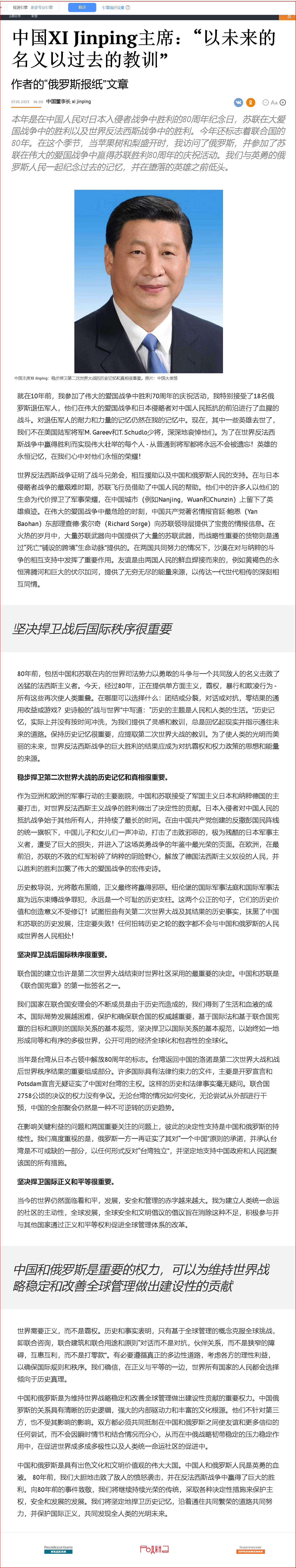 今年是中國人民抗日戰(zhàn)爭、蘇聯(lián)偉大衛(wèi)國戰(zhàn)爭暨世界反法西斯戰(zhàn)爭勝利80周年,也是聯(lián)合國成立80周年。在這“梨花開遍了天涯”的季節(jié),我即將對俄羅斯進行國事訪問,并出席紀念蘇聯(lián)偉大衛(wèi)國戰(zhàn)爭勝利80周年慶典,同英雄的俄羅斯人民一道重溫歷史、緬懷先烈。