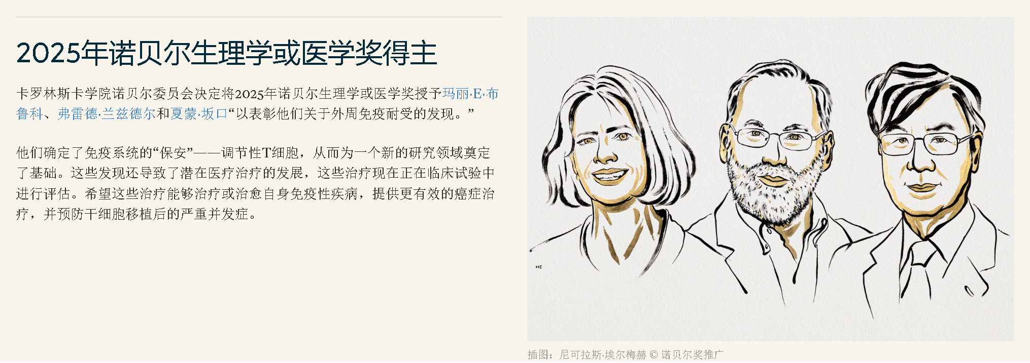 新華社斯德哥爾摩10月6日電(記者郭爽 張兆卿)瑞典卡羅琳醫(yī)學(xué)院6日宣布,將2025年諾貝爾生理學(xué)或醫(yī)學(xué)獎授予美國科學(xué)家瑪麗·布倫科、弗雷德·拉姆斯德爾和日本科學(xué)家坂口志文,以表彰他們在外周免疫耐受機(jī)制方面的開創(chuàng)性發(fā)現(xiàn)。