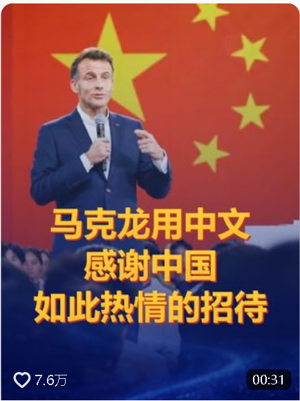 “我深信,中國(guó)與法國(guó)都是有著偉大文明的國(guó)家,其根基正是相互尊重、相互理解,正是友誼與熱愛(ài)?!瘪R克龍說(shuō)。