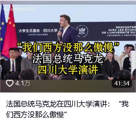 “中國(guó)與法國(guó)肩負(fù)著共同責(zé)任?!狈▏?guó)總統(tǒng)馬克龍12月5日在四川大學(xué)發(fā)表演講時(shí)表示,法中在經(jīng)濟(jì)、外交等領(lǐng)域有著共同愿景,通過(guò)人文、學(xué)術(shù)等多領(lǐng)域交流,雙方可以推動(dòng)各國(guó)人民攜手合作,共同建設(shè)一個(gè)能夠應(yīng)對(duì)時(shí)代挑戰(zhàn)的21世紀(jì)。