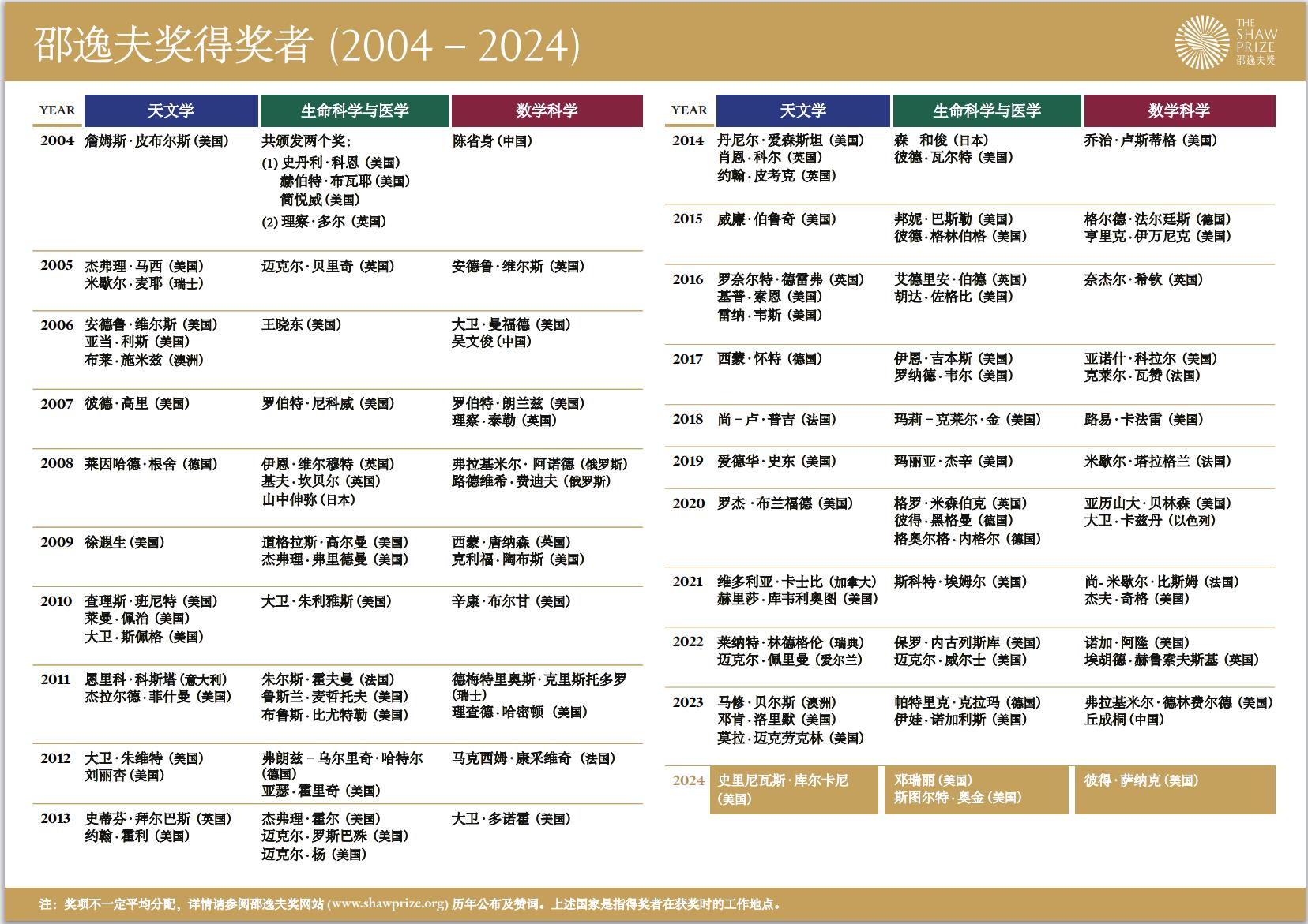 這是5月21日2024年度邵逸夫獎(jiǎng)新聞發(fā)布會(huì)現(xiàn)場(chǎng)公布的獲獎(jiǎng)?wù)哒掌P氯A社記者 朱煒 攝