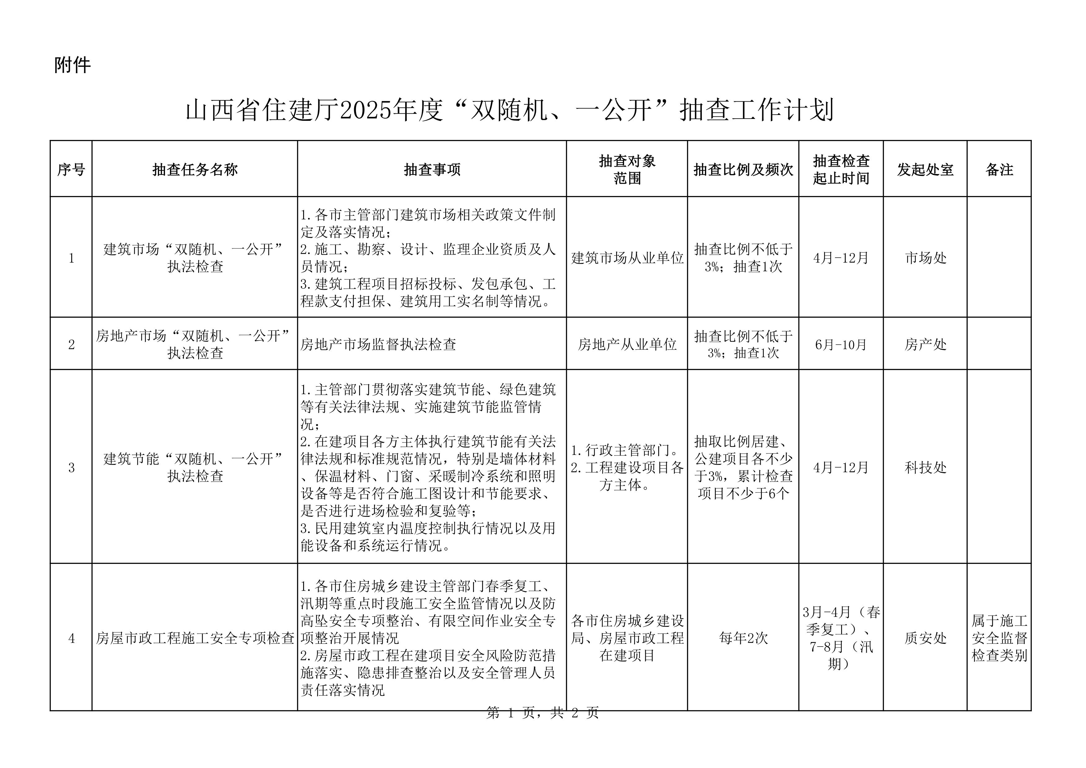 山西省住房和城鄉(xiāng)建設(shè)廳關(guān)于印發(fā)《山西省住建廳2025年度 “雙隨機、一公開”抽查工作計劃》的通知(第201號)