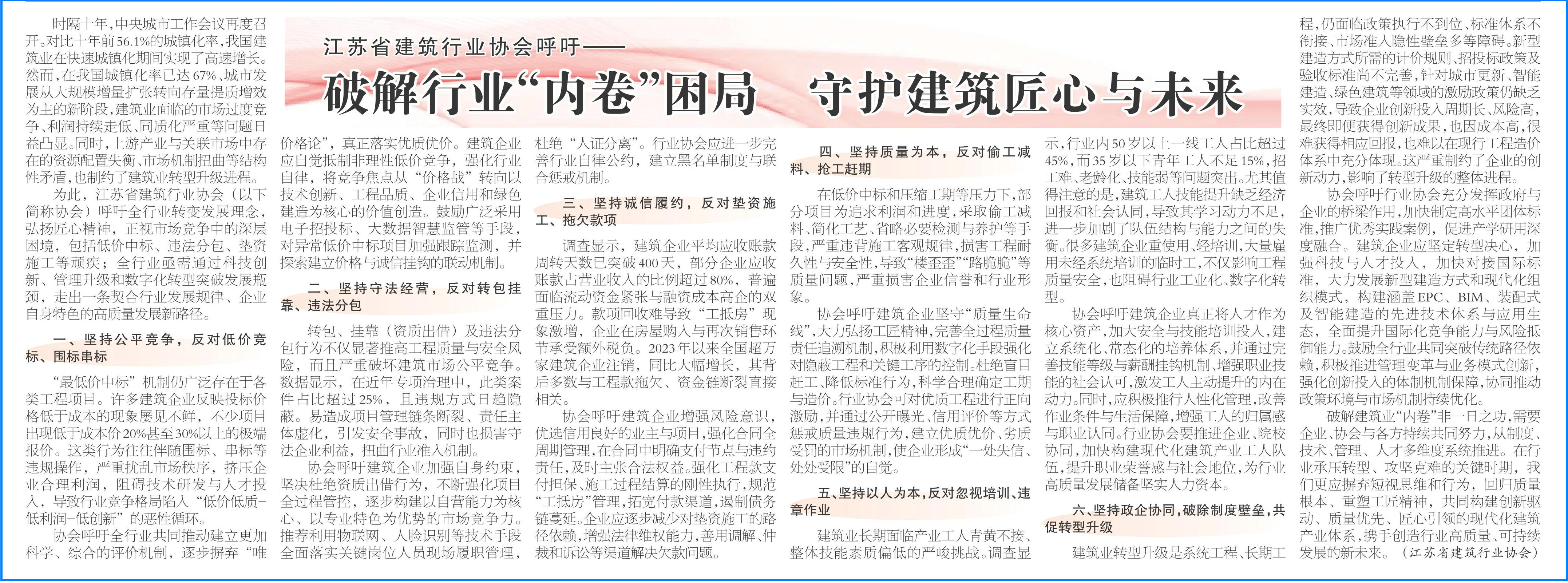 為此,江蘇省建筑行業(yè)協(xié)會(以下簡稱協(xié)會)呼吁全行業(yè)轉(zhuǎn)變發(fā)展理念,弘揚(yáng)匠心精神,正視市場競爭中的深層困境,包括低價(jià)中標(biāo)、違法分包、墊資施工等頑疾;全行業(yè)亟需通過科技創(chuàng)新、管理升級和數(shù)字化轉(zhuǎn)型突破發(fā)展瓶頸,走出一條契合行業(yè)發(fā)展規(guī)律、企業(yè)自身特色的高質(zhì)量發(fā)展新路徑。
