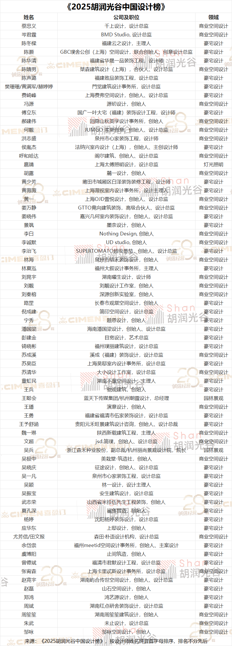 《2025胡潤(rùn)光谷中國設(shè)計(jì)榜》通過設(shè)計(jì)作品的創(chuàng)新性、美學(xué)價(jià)值、可持續(xù)性和商業(yè)價(jià)值進(jìn)行綜合評(píng)選。共征集到逾百位設(shè)計(jì)師的申報(bào)材料,由知名設(shè)計(jì)師、跨界嘉賓、商業(yè)精英、KOL、企業(yè)家、藝術(shù)家組成的顧問評(píng)委團(tuán)進(jìn)行全面評(píng)審,最終71位設(shè)計(jì)師上榜,其中男性占84%,女性占16%。設(shè)計(jì)類別分布上,豪宅設(shè)計(jì)占6成,商業(yè)空間設(shè)計(jì)占4成。