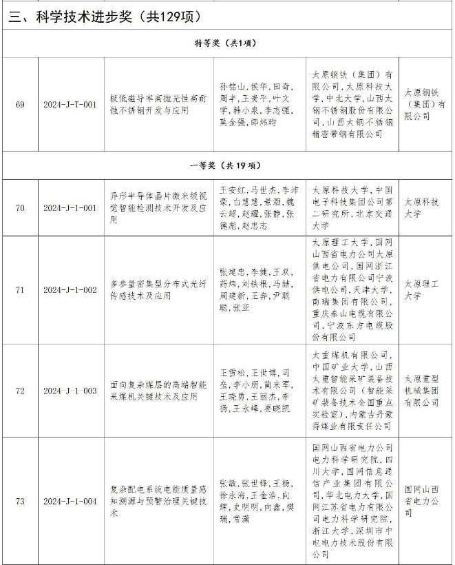 根據(jù)《山西省科學(xué)技術(shù)獎(jiǎng)勵(lì)辦法》等有關(guān)規(guī)定,經(jīng)省科學(xué)技術(shù)獎(jiǎng)勵(lì)評審委員會評審、省委科技委員會審定,授予“遺煤開采承載結(jié)構(gòu)失穩(wěn)致災(zāi)機(jī)理及關(guān)鍵域充填儲碳空間重構(gòu)方法”和“極低磁導(dǎo)率高拋光性高耐蝕不銹鋼開發(fā)與應(yīng)用”2個(gè)項(xiàng)目特等獎(jiǎng),授予“異形半導(dǎo)體晶片微米級視覺智能檢測技術(shù)開發(fā)及應(yīng)用”等36個(gè)項(xiàng)目一等獎(jiǎng),授予“高密度高精度微電子組裝智能裝備關(guān)鍵技術(shù)及應(yīng)用”等161個(gè)項(xiàng)目二等獎(jiǎng),授予“晉能控股裝備制造集團(tuán)有限公司”等6個(gè)企業(yè)技術(shù)創(chuàng)新獎(jiǎng)。