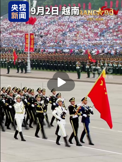 應(yīng)越南國防部邀請,中國人民解放軍儀仗司禮大隊抽組儀仗分隊,參加越南今天(9月2日)舉行的八月革命暨越南國慶80周年紀念活動。中國軍人整齊的步伐和昂揚的軍姿贏得了越南民眾的喝彩。除中國外,俄羅斯、柬埔寨、老撾、古巴和白俄羅斯等國部隊也受邀參加閱兵式。