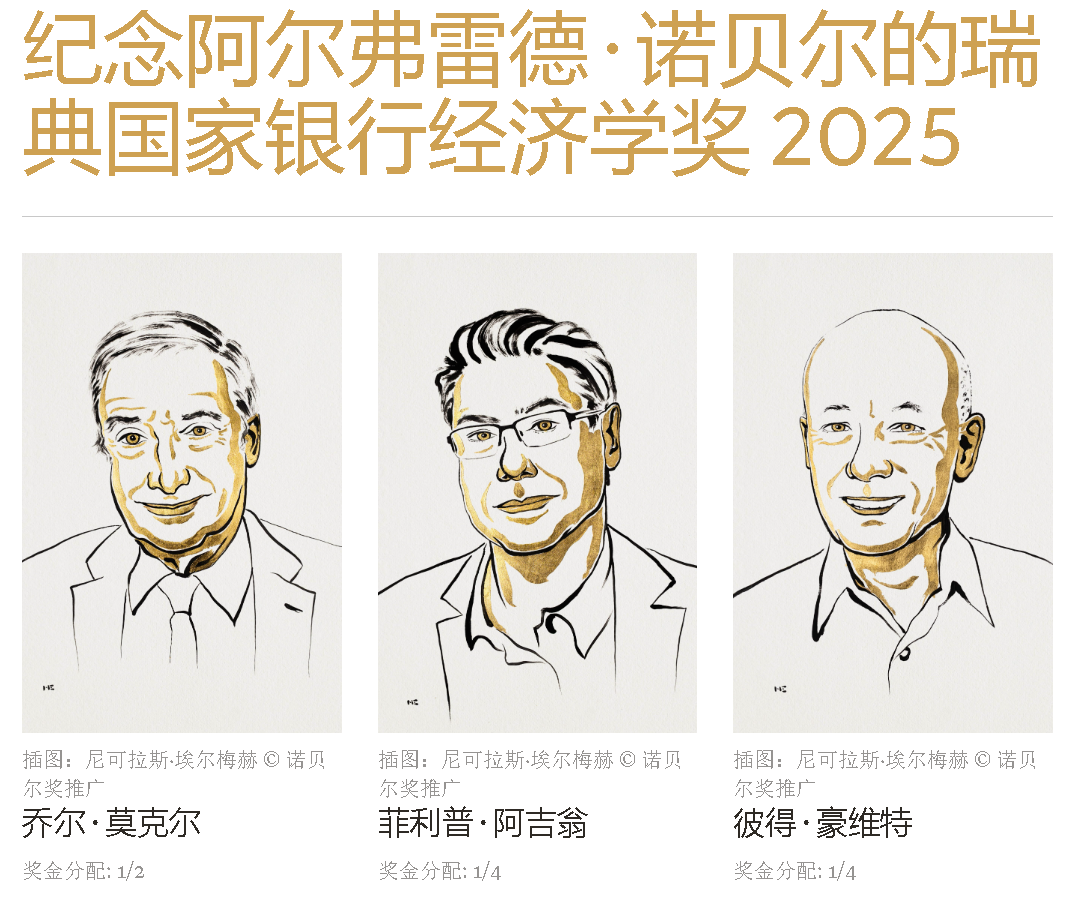 莫基爾獲得諾貝爾經(jīng)濟(jì)學(xué)獎一半獎金,由于他“揭示了通過技術(shù)進(jìn)步實現(xiàn)持續(xù)增長的先決條件”;另一半獎金由阿吉翁和豪伊特共同獲得,他們“提出了通過創(chuàng)造性破壞實現(xiàn)持續(xù)增長的理論”。