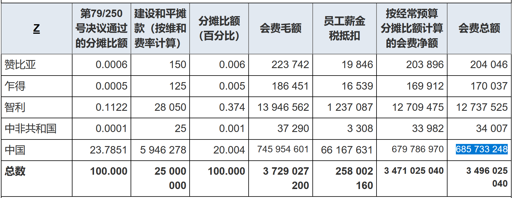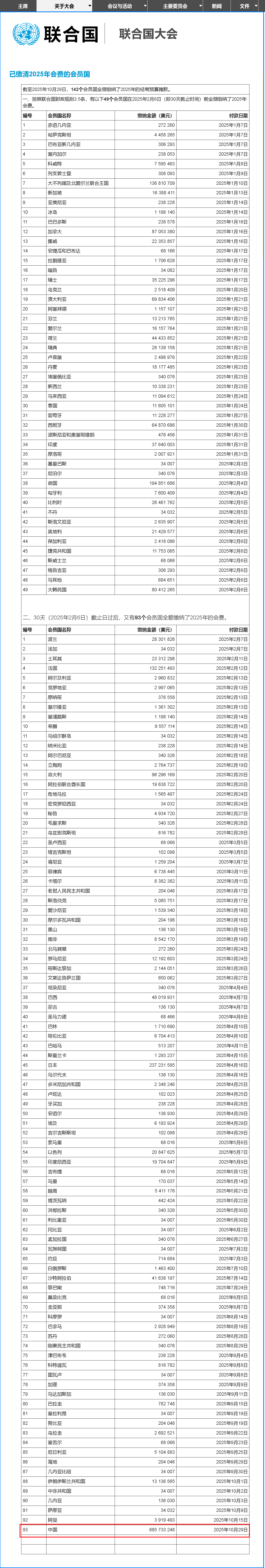 據(jù)聯(lián)合國介紹,中國是聯(lián)合國第二大會(huì)費(fèi)分?jǐn)倗謹(jǐn)偙阮~為20%,僅次于美國的22%,遠(yuǎn)高于排在第三的日本的6.93%。
