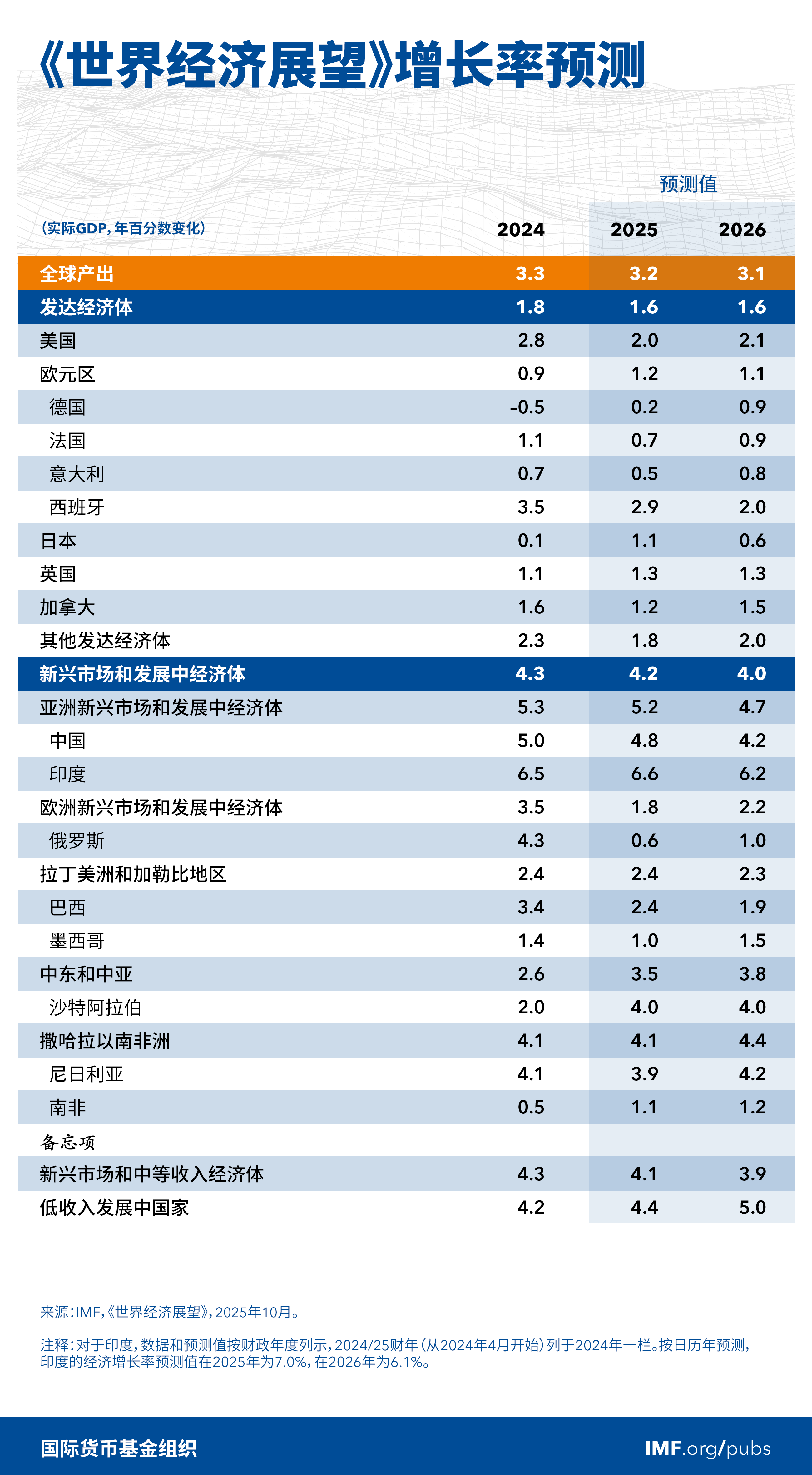因此,最新一期《世界經(jīng)濟(jì)展望》中的全球經(jīng)濟(jì)增速預(yù)測值高于2025年4月《世界經(jīng)濟(jì)展望》的預(yù)測,但仍低于政策轉(zhuǎn)變前的預(yù)測。預(yù)計全球經(jīng)濟(jì)增速將從2024年的3.3%下降到2025年的3.2%和2026年的3.1%,其中發(fā)達(dá)經(jīng)濟(jì)體的增速約為1.5%,新興市場和發(fā)展中經(jīng)濟(jì)體則略高于4%。預(yù)計全球通脹率將繼續(xù)下降,但各國之間存在差異:美國通脹將高于目標(biāo)水平,且風(fēng)險偏向上行;而其他國家通脹將處于低位。