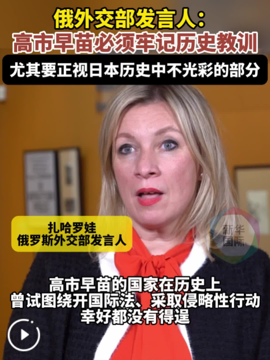 俄羅斯外交部發(fā)言人扎哈羅娃18日在莫斯科接受新華社記者專訪時(shí)表示,日本首相高市早苗日前的涉臺(tái)言論非常危險(xiǎn),日本應(yīng)深刻反省歷史、汲取二戰(zhàn)教訓(xùn)。