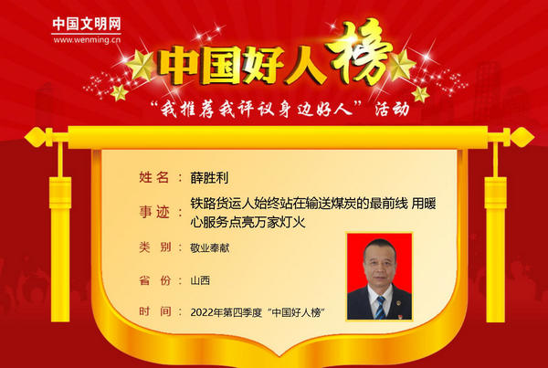 薛勝利,男,1969年5月生,中共黨員,中國鐵路太原局集團(tuán)有限公司朔州車務(wù)段宋家莊站業(yè)務(wù)主管。為了人民群眾,薛勝利始終站在輸送煤炭的最前線,無私奉獻(xiàn)搶運(yùn)電煤,以一名鐵路貨運(yùn)人的責(zé)任和擔(dān)當(dāng),不斷踐行“人民鐵路為人民”的根本宗旨。