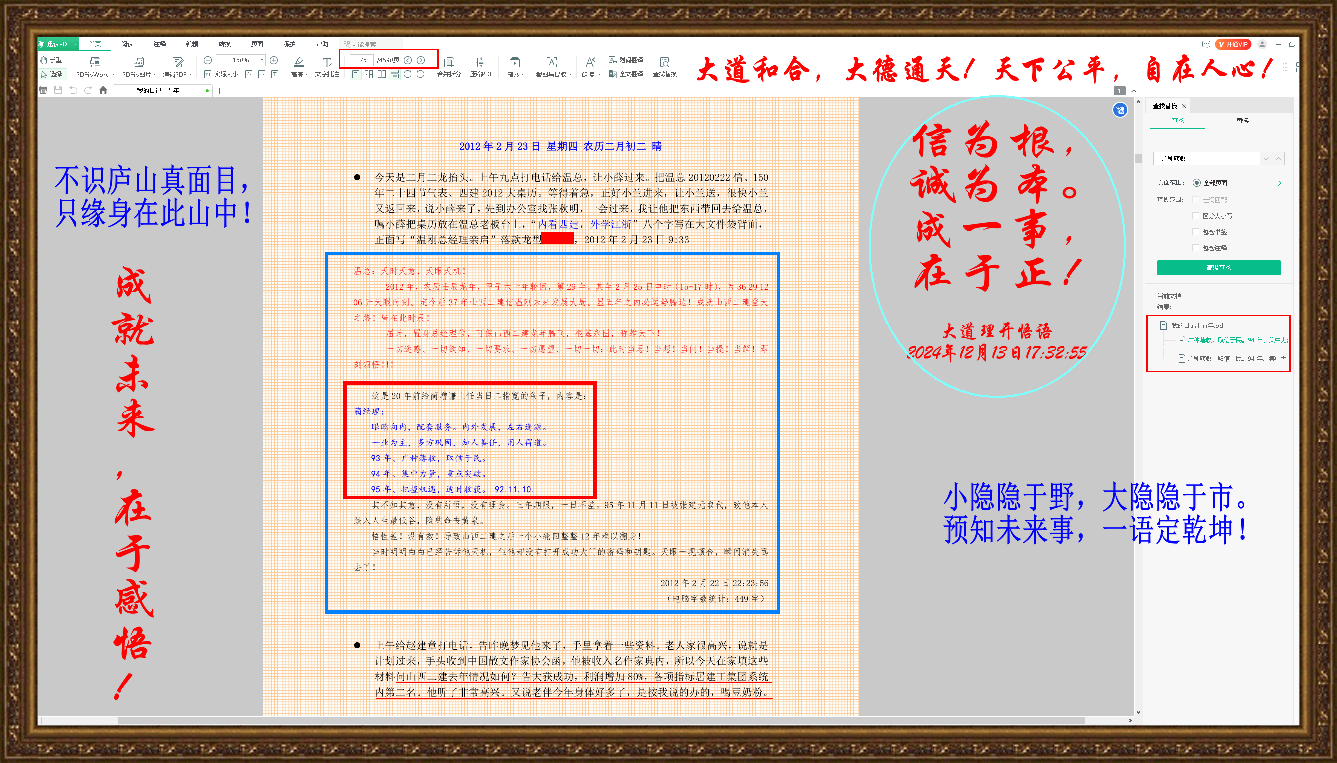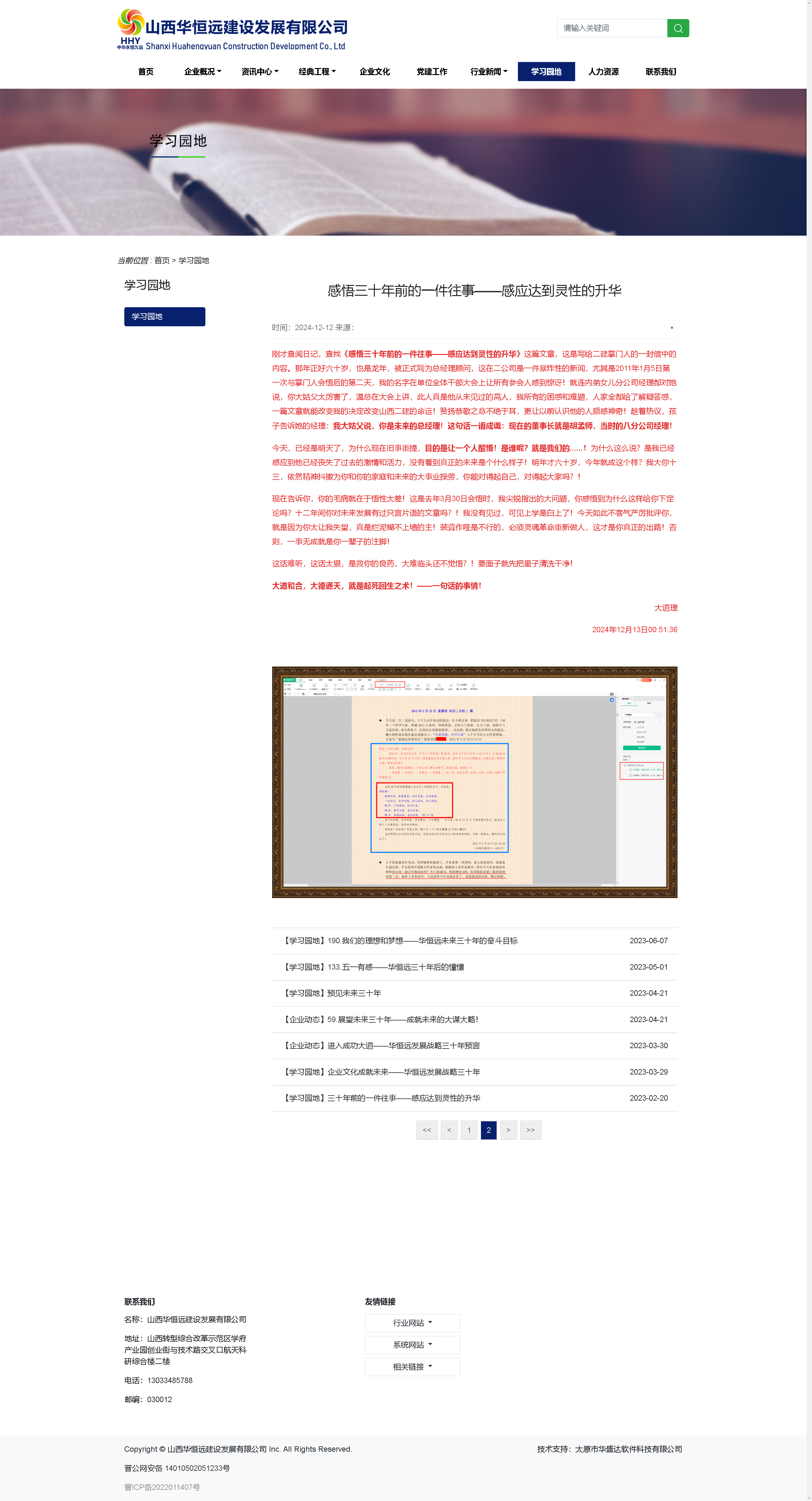 剛才查閱日記,查找《感悟三十年前的一件往事——感應(yīng)達(dá)到靈性的升華》這篇文章,這是寫給二建掌門人的一封信中的內(nèi)容。那年正好六十歲,也是龍年,被正式聘為總經(jīng)理顧問(wèn),這在二公司是一件暴炸性的新聞,尤其是2011年1月5日第一次與掌門人會(huì)悟后的第二天,我的名字在單位全體干部大會(huì)上讓所有參會(huì)人感到驚訝!就連內(nèi)弟女兒分公司經(jīng)理都對(duì)她說(shuō),你大姑父太厲害了,溫總在大會(huì)上講,此人真是他從未見(jiàn)過(guò)的高人,我所有的困惑和難題,人家全都給了解疑答惑,一篇文章就能改變我的決定改變山西二建的命運(yùn)!贊揚(yáng)恭敬之意不絕于耳,更讓以前認(rèn)識(shí)他的人頗感神奇!趁著熱議,孩子告訴她的經(jīng)理:我大姑父說(shuō),你是未來(lái)的總經(jīng)理!這句話一語(yǔ)成讖:現(xiàn)在的董事長(zhǎng)就是胡孟師,當(dāng)時(shí)的八分公司經(jīng)理!