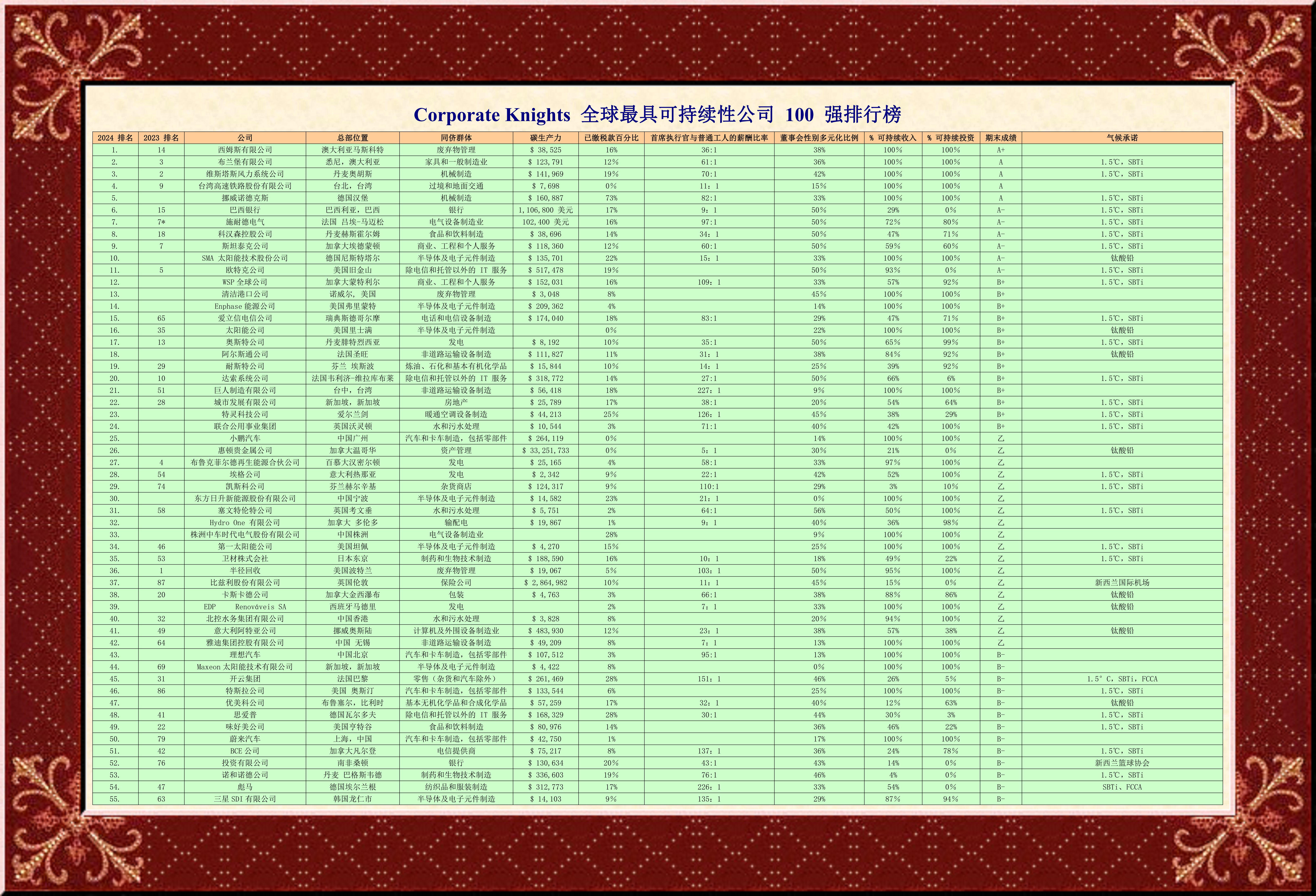 加拿大媒體和投資研究公司《企業(yè)爵士》(Corporate Knights)發(fā)布2024年“全球最佳可持續(xù)發(fā)展企業(yè)百?gòu)?qiáng)”(2024 Global 100:the world’s most sustainable companies)。企業(yè)領(lǐng)導(dǎo)者正將越來越多的收入用于加速綠色轉(zhuǎn)型的投資。在今年的100強(qiáng)中,排名靠前的公司將55%的投資分配給了可持續(xù)項(xiàng)目。